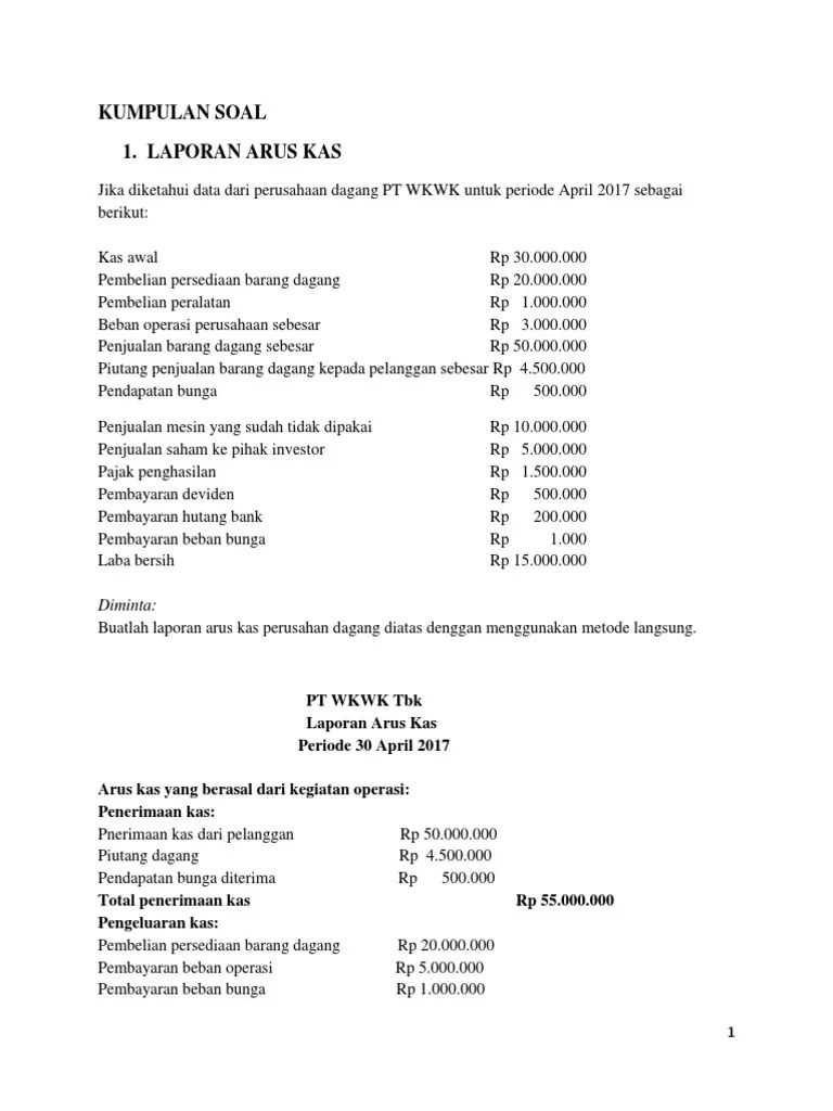 Laporan arus kas yaitu laporan yang menyajikan rangkuman pendapatan dan pengeluaran keuangan perusahaan selama satu periode tertentu. Arus kas masuk dan keluar dirinci lebih lanjut dalam beberapa jenis penerimaan atau pengeluaran kas. Laporan arus kas bertindak sebagai jembatan antara laporan laba rugi dan neraca dengan menunjukkan bagaimana uang masuk dan keluar dari . Contoh soal dan jawaban laporan arus kas perusahaan dagang. Dalam artikel kali ini akan dibahas contoh laporan arus kas, yaitu contoh laporan arus kas perusahaan jasa, dan perusahaan dagang. Ini adalah cara menyusun laporan arus kas dengan menghitung arus kas dari komponen aktivitas operasi sesuai . Setelah membuat laporan laba/rugi dan mencatat jurnal penutup, perusahaan membuat laporan perubahan modal, neraca, dan laporan arus kas. Artikel ini menjelaskan⏩tentang contoh laporan⏩arus kas perusahaan dagang⏩dan jasa⭐terdapat 4 bagian⏩dari laporan arus kas⭐terdapat . Play this game to review business. Laporan arus kas/ laporan kas (cash flow statement), dan catatan atas laporan keuangan. Sementara itu dengan metode tidak langsung, . Penjualan aktiva tetap dalam laporan arus kas disajikan sebagai. Contoh soal akuntansi keuangan 2 departemen akuntansi feui 29 berikut adalah laporan posisi .